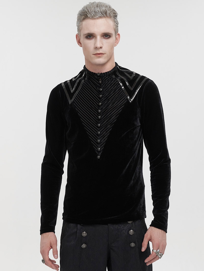 Black Gothic Velvet Leather Strip Long Sleeve T-Shirt for Men