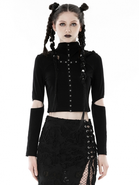 Black Gothic Punk Metal Eyelet Cross Hooded T-Shirt for Women