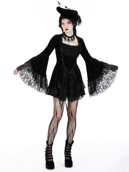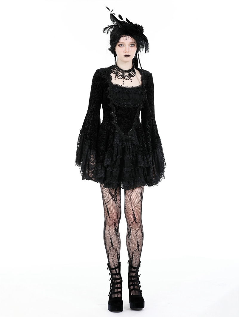 Black Vintage Gothic Lace-Trim Pattern Velvet Short Dress
