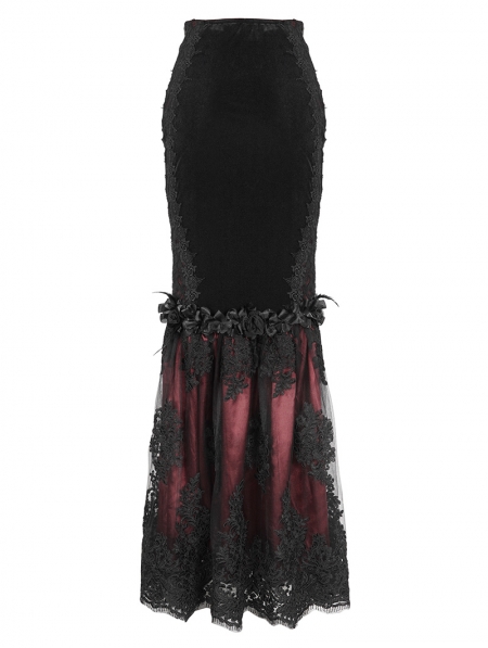 Black and Red Gothic Vintage Velvet Lace Spliced Fishtail Maxi Skirt