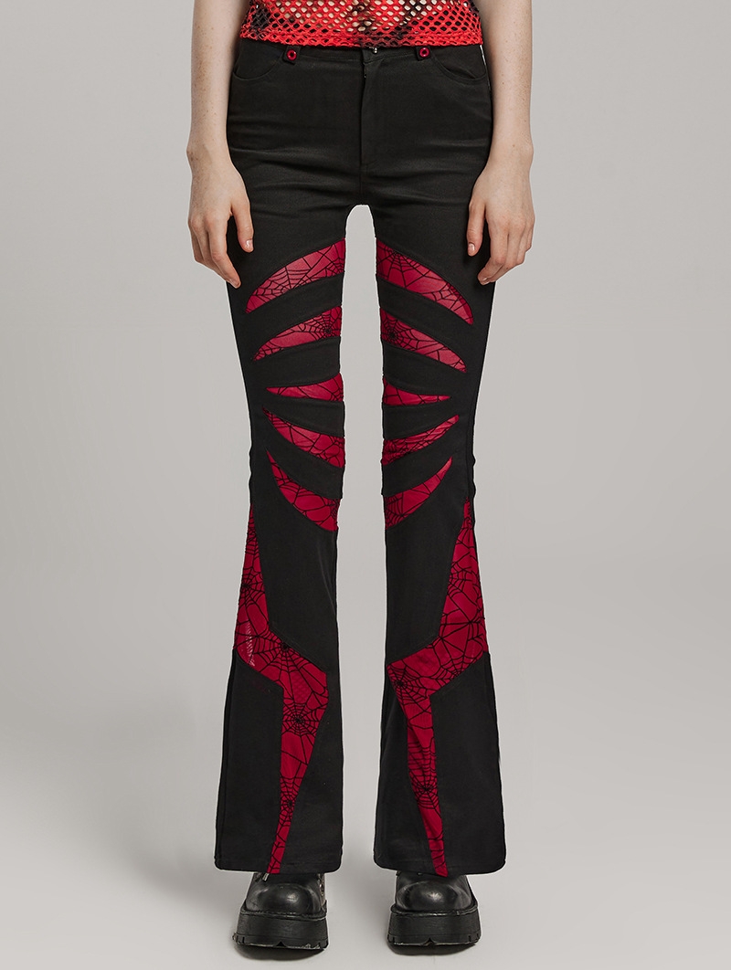 Black and Red Gothic Pointed Spider Web Flared Trousers for Women