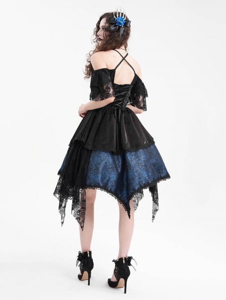 Black and Blue Gothic Off-the-Shoulder Lace Halter Short Party Dress