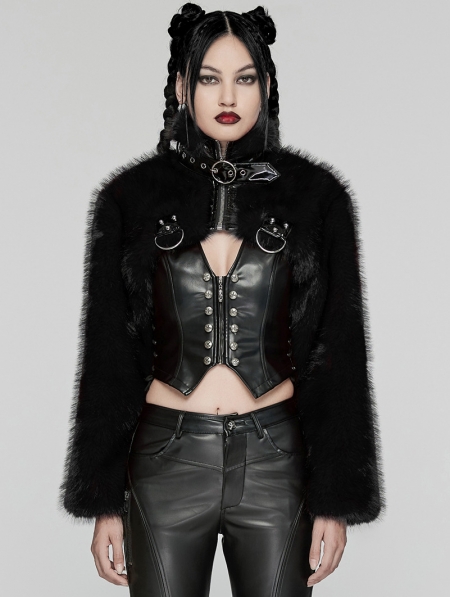 Black Gothic Punk Personalized Zipper Short Fur Jacket for Women