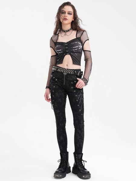 Black Gothic Punk Cut Out Fishnet Sleeve Crop Top for Women