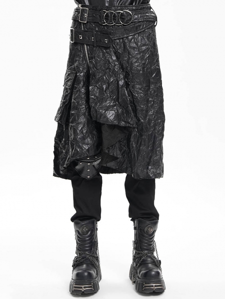 Black Gothic Buckle Blet Zipper Asymmetric Skirt for Men