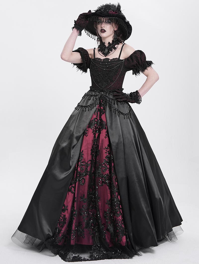 Black and Red Gothic Off-the-Shoulder Beaded Lace Applique Long Party Ball Gown