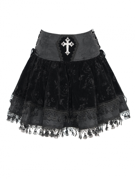 Black Gothic Cross Velvet Splicing Fringe Short Skirt