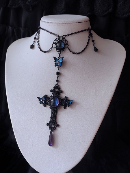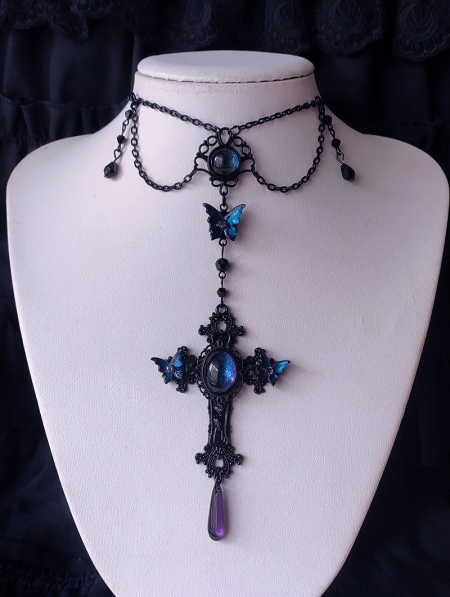 Dark Blue Gothic Butterfly Cross Pendant Necklace