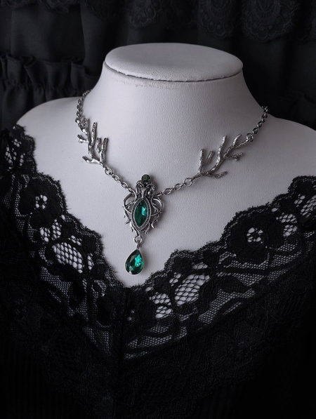 Silver Gothic Thorn Branch Green Crystal Pendant Necklace