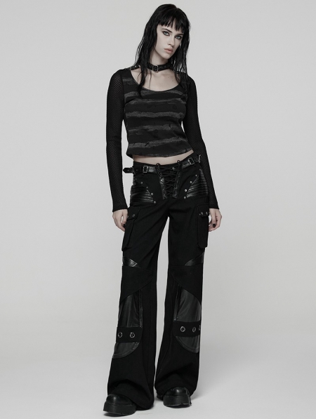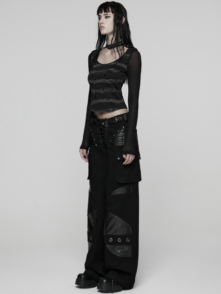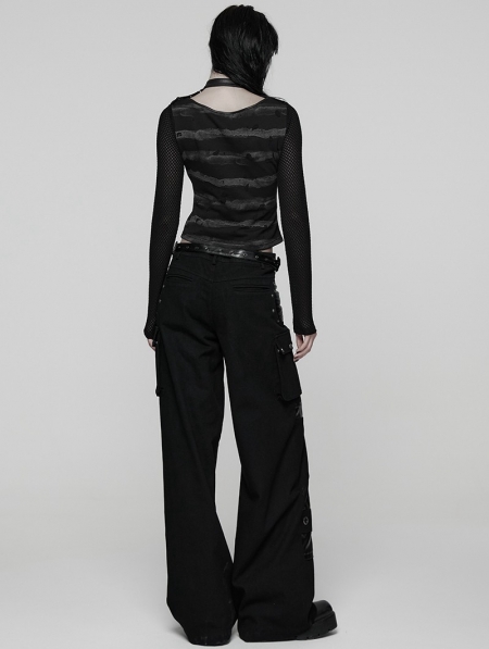 Black and Grey Gothic Punk Stripe Short T-shirt for Women