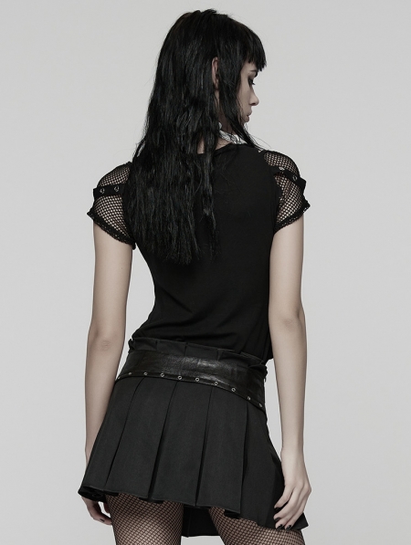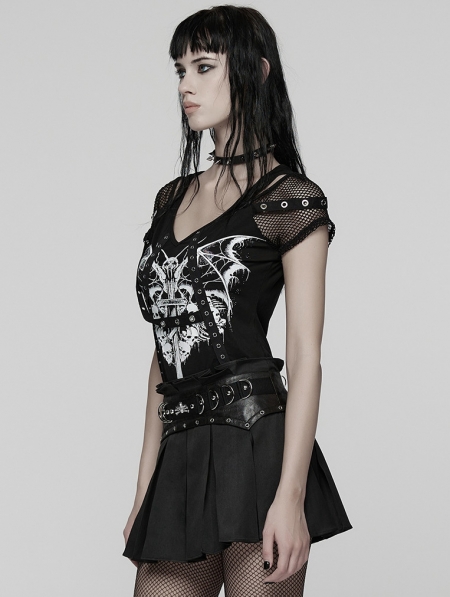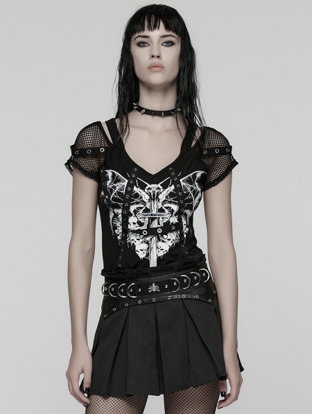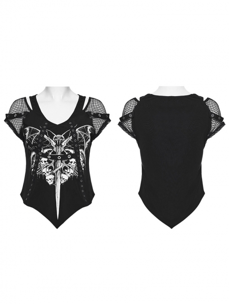 Black Gothic Punk Printed Mesh Spliced T-shirt for Women