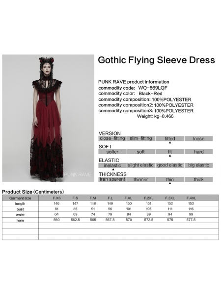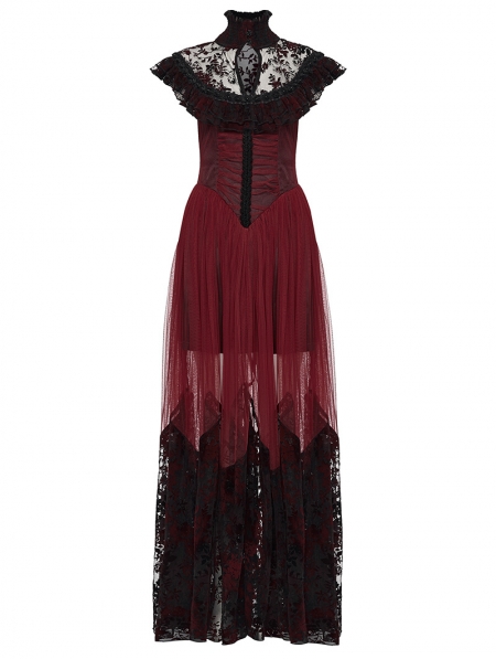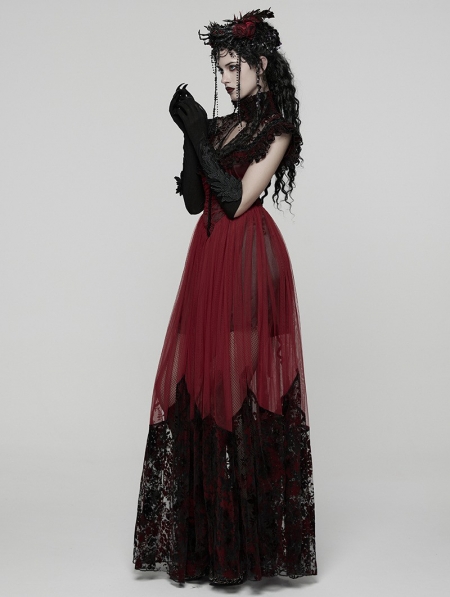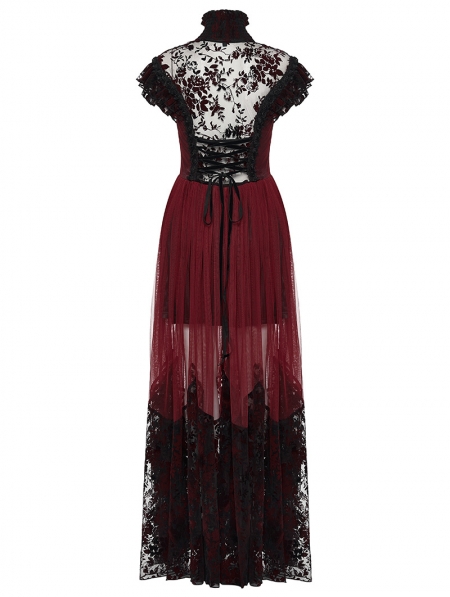 Red and Black Gothic Flocking Mesh Spliced Flutter Sleeve Long Party Dress