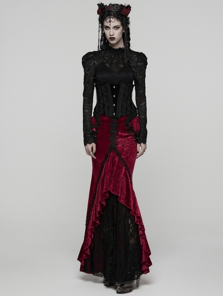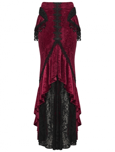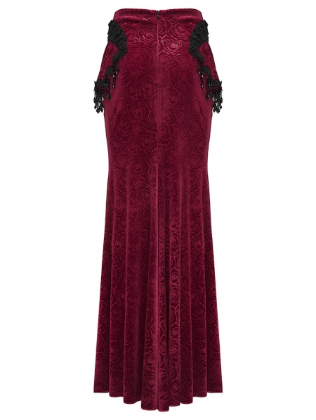 Red and Black Gothic Gorgeous Velvet Beaded Tassel Fishtail Maxi Skirt