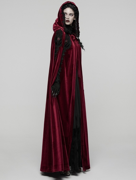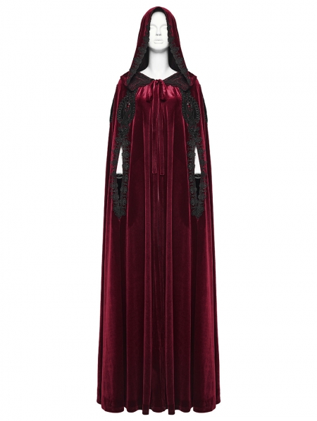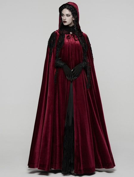 Red Gothic Embroidered Velvet Hooded Long Cloak for Women