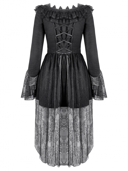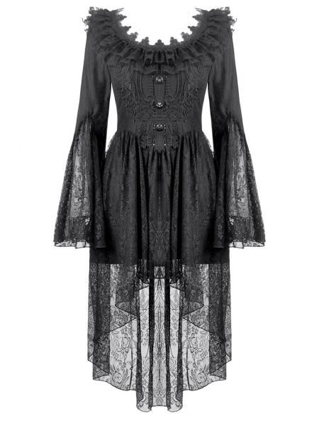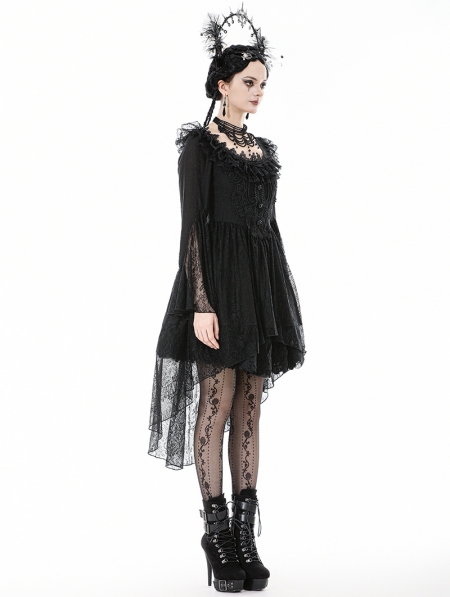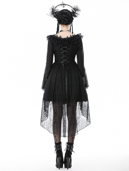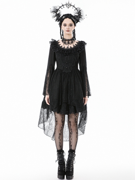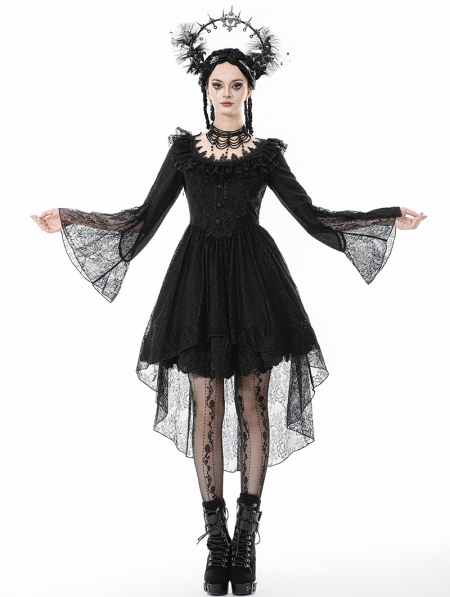 Black Gothic Ruffle Lace Bell Sleeve High-Low Dress