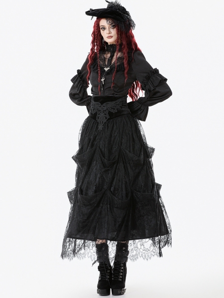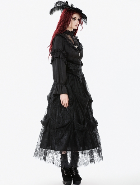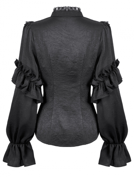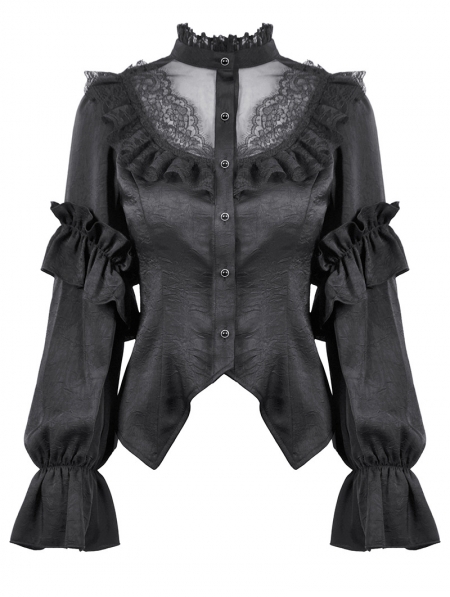 Black Gothic Ruffled Lace Illusion Neck Blouse for Women