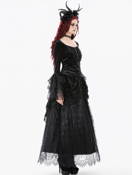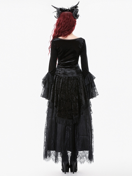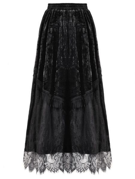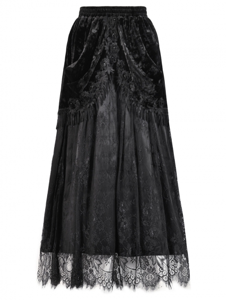 Black Gothic Court Floral Tassel Lace Velvet Maxi Skirt