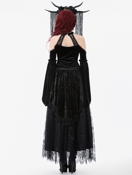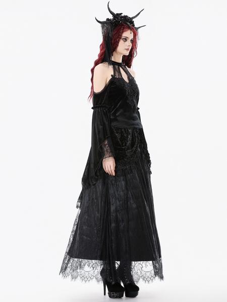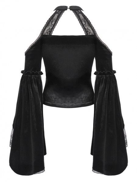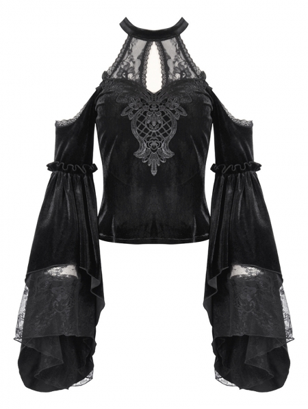 Black Gothic Retro Lace Applique Off-Shoulder Velvet Top for Women