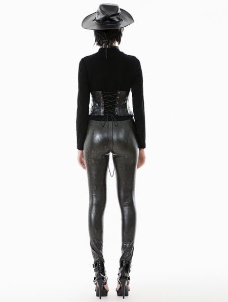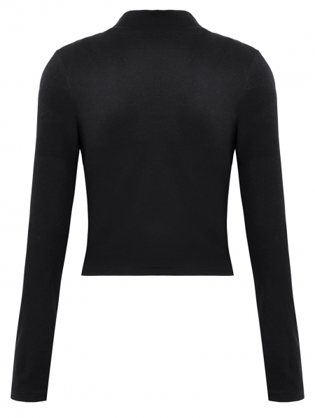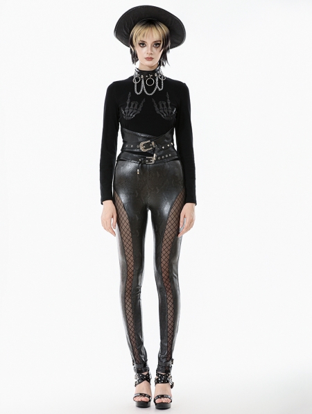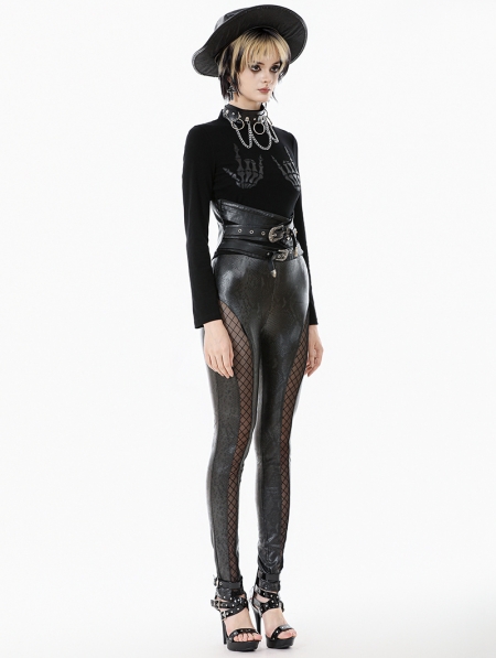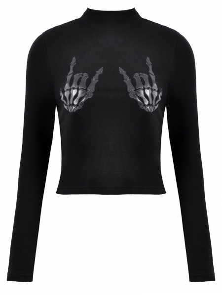Black Gothic Punk Skeleton Hand Leather Applique T-Shirt for Women