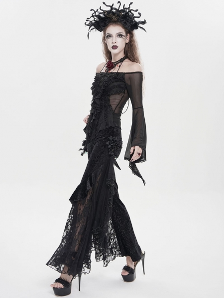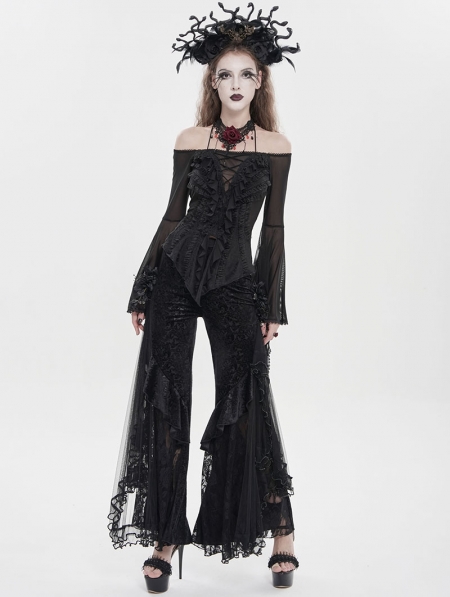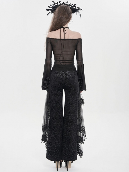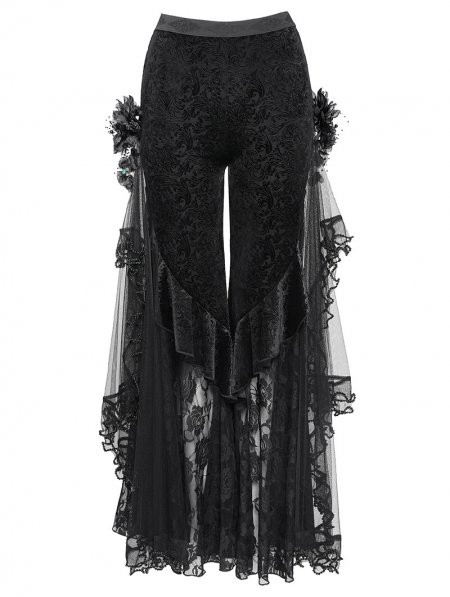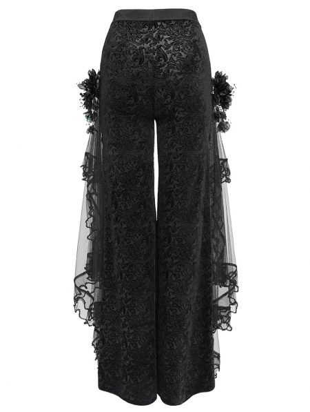 Black Vintage Gothic Flower Mesh Velvet Flared Pants for Women