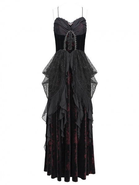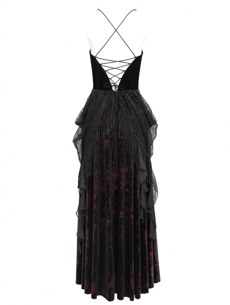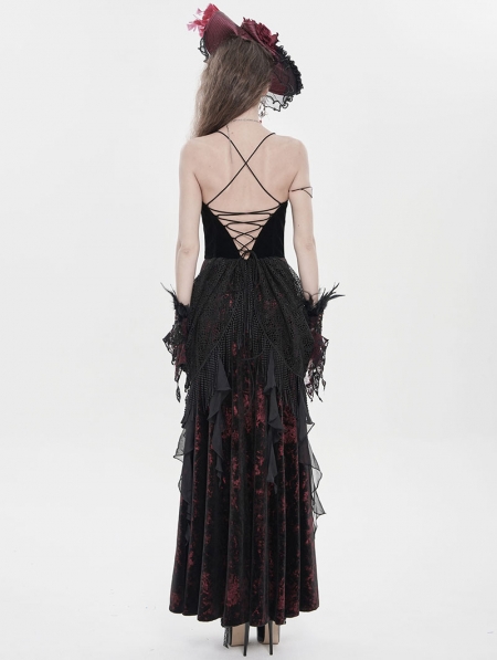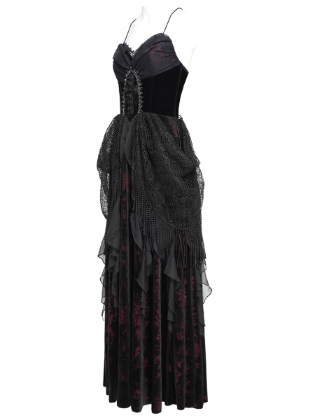 Black and Red Vintage Gothic Sexy Strappy Backless Velvet Long Party Dress