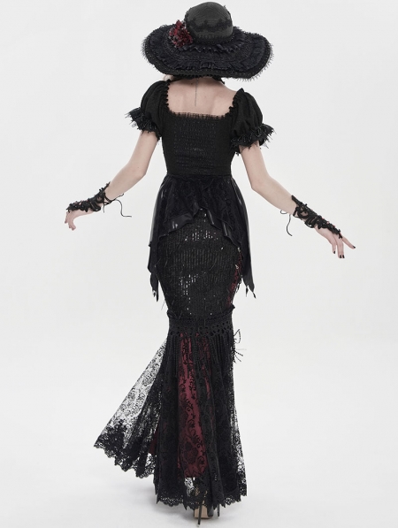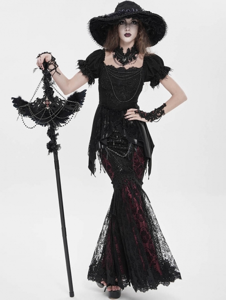 Black and Red Gothic Floral Lace Embroidered Tasseled Fishtail Skirt