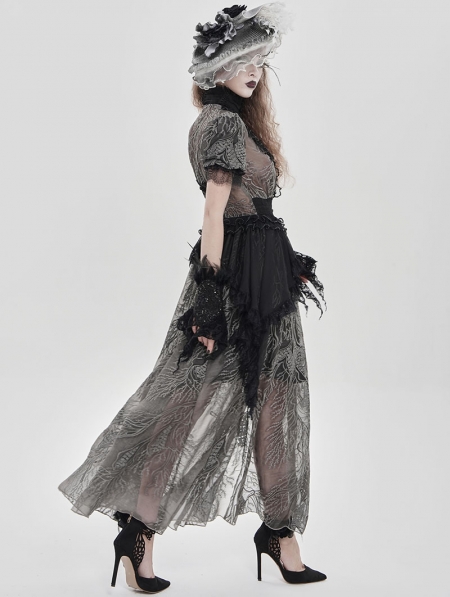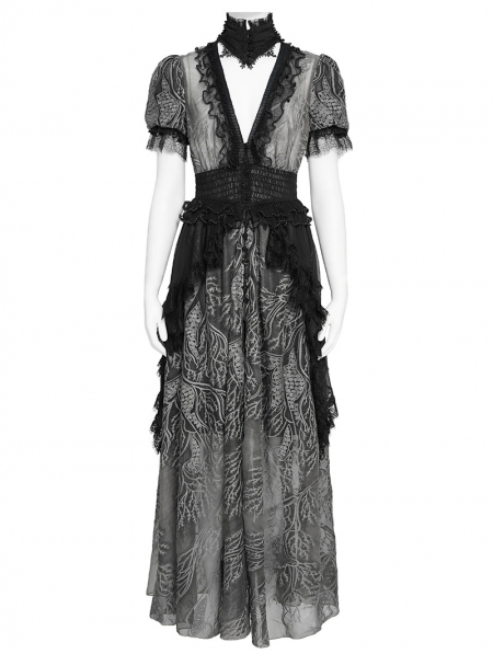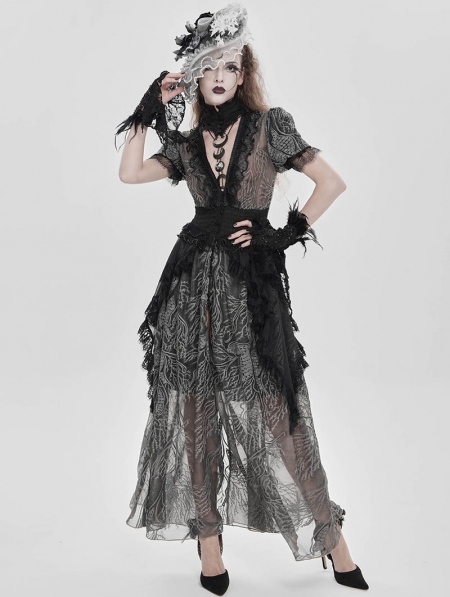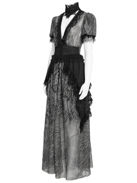 Black and Grey Gothic Deep V-Neck High Slit Floral Mesh Long Dress