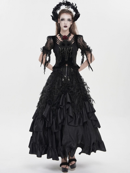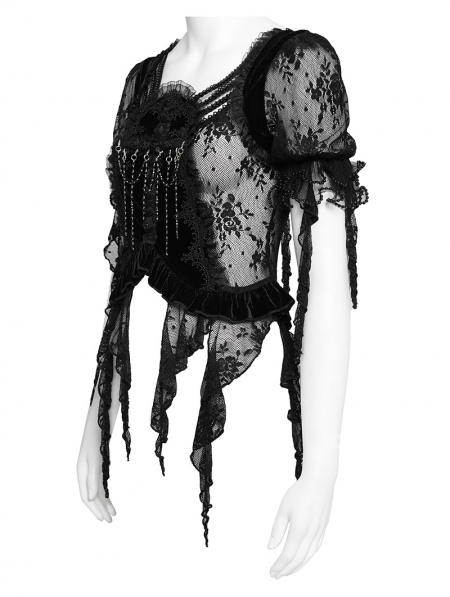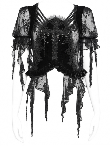 Black Gothic Floral Mesh Ruffled Tassel Trim Shirt for Women
