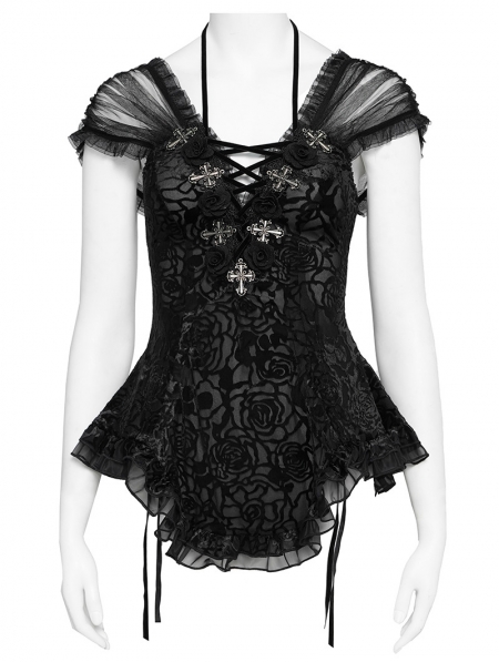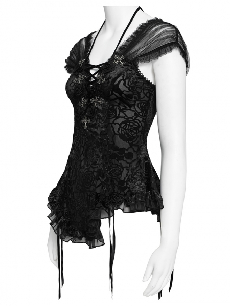 Black Gothic Sexy Mesh Ruched Ruffle Halter Strap Shirt for Women