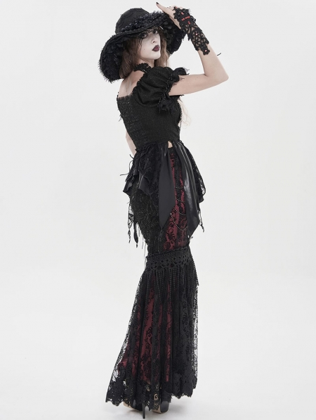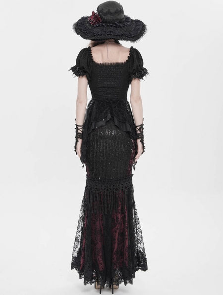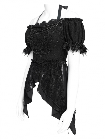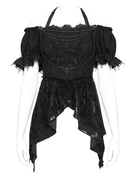 Black Retro Gothic Embroidered Beaded Halter Shirt for Women