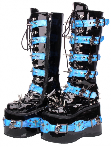 Black and Blue Gothic Punk Patchwork Platform Knee High Boots