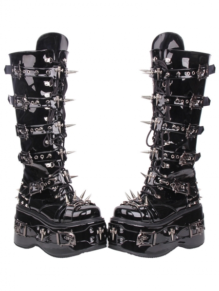 Black Gothic Skull Buckled Punk Platform Knee High Boots
