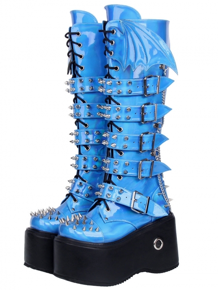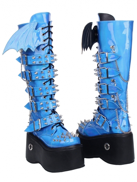 Blue Gothic Punk Batwing Spike Studded Platform Knee High Boots