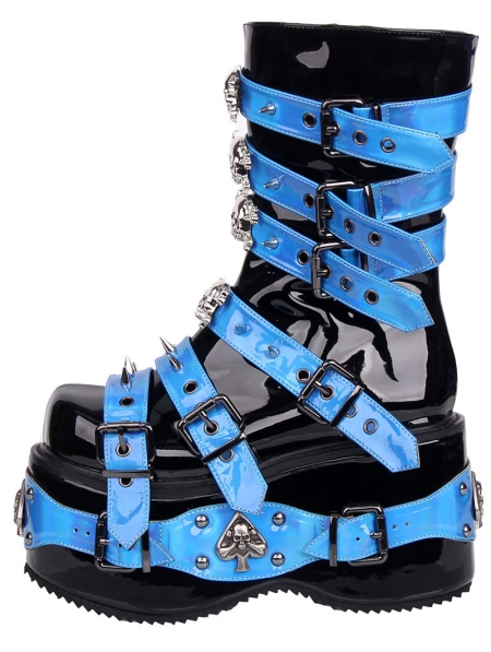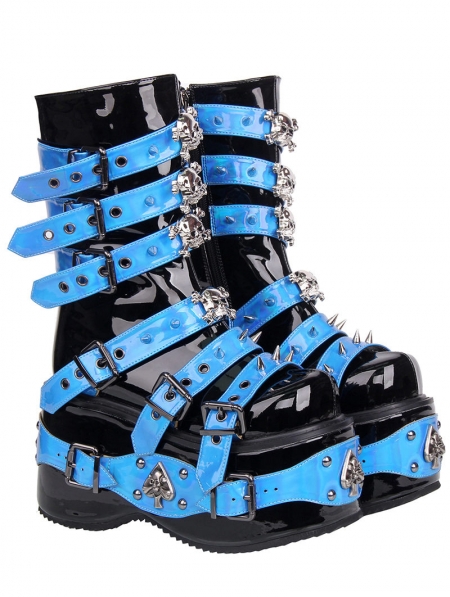 Black and Blue Gothic Punk Skull Stud Strap Platform Boots
