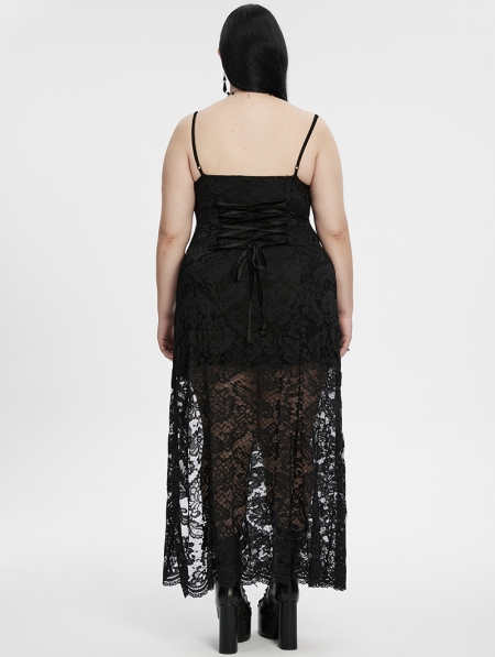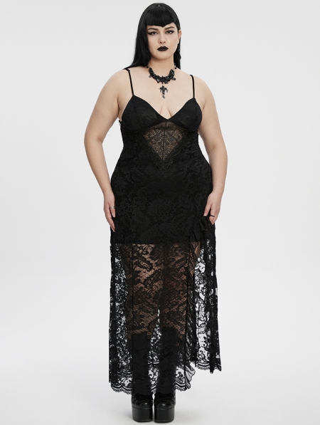Black Sexy Gothic Lace Deep V-Neck High Slit Plus Size Long Dress