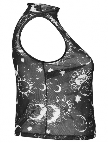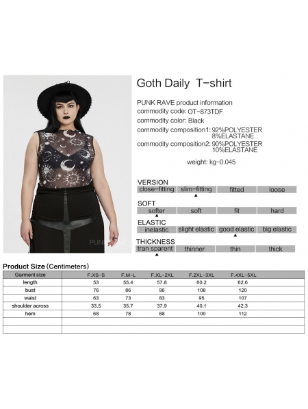 Black Gothic Daily Print Fitted Sleeveless Mesh Plus Size T-Shirt for Women