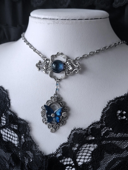 Silver Openwork Blue Butterfly Wings Crystal Pendant Necklace