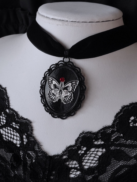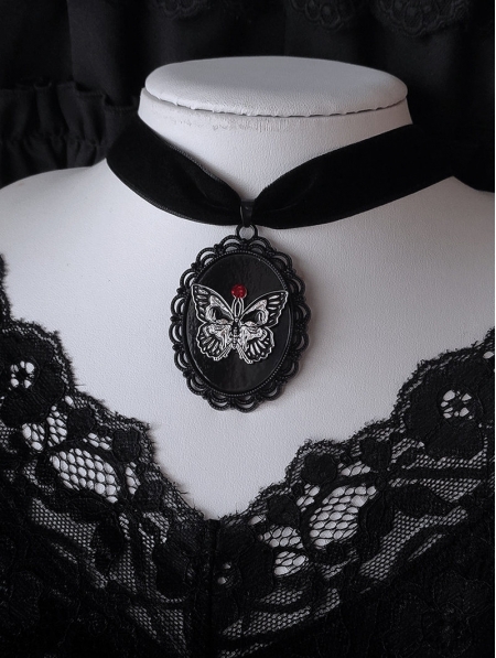 Black Gothic Skull Butterfly Framed Pendant Velvet Choker
