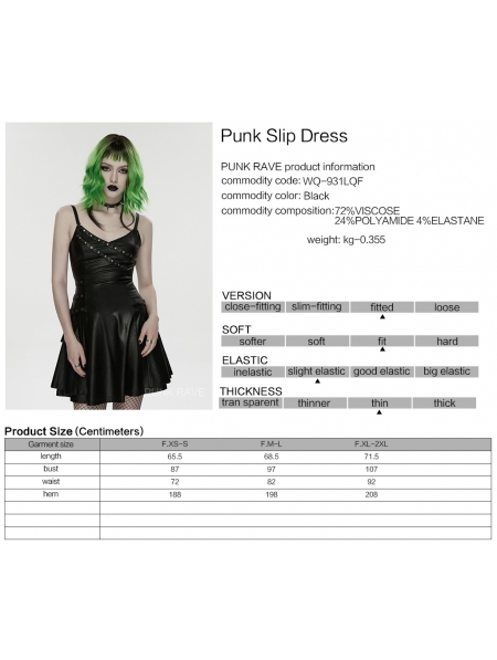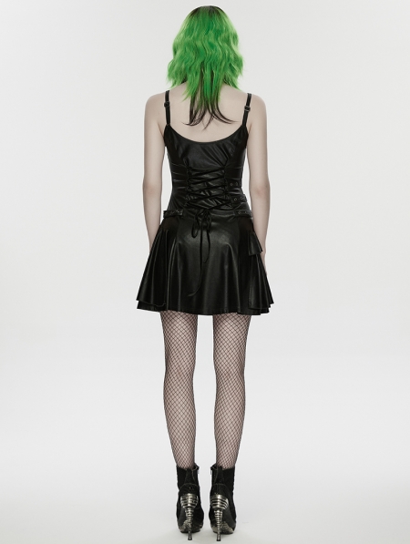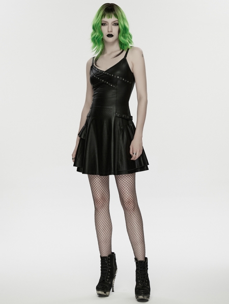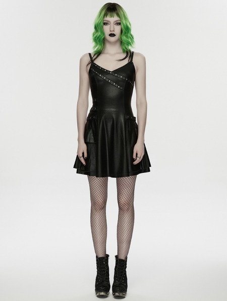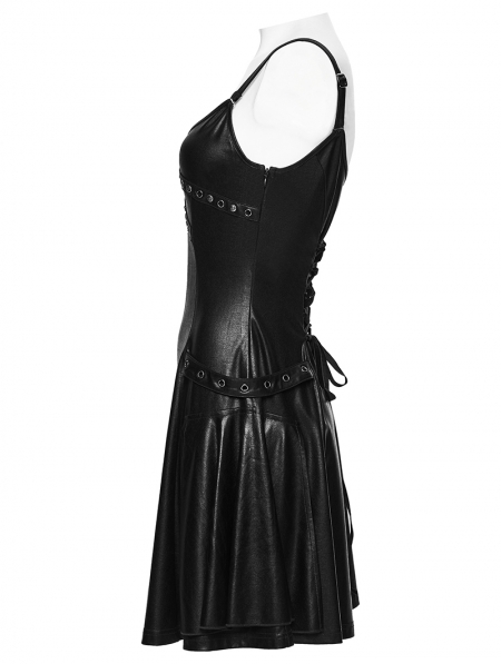 Black Gothic Punk PU Leather Rivets Slip A-Line Dress