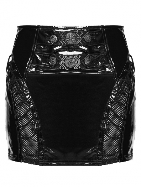 Black Gothic Punk Mesh Spliced Glossy Patent Leather Mini Skirt