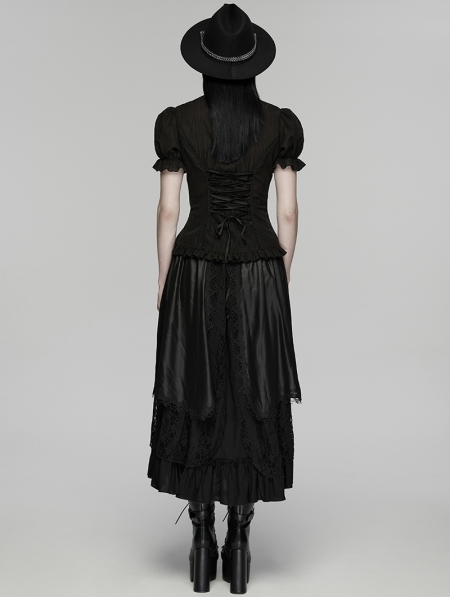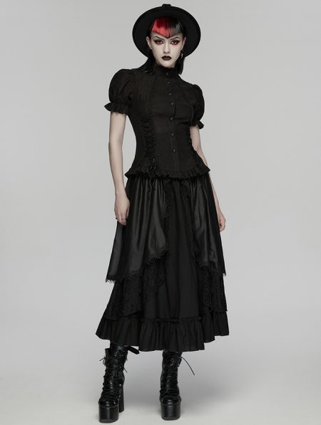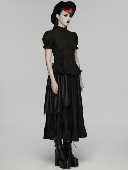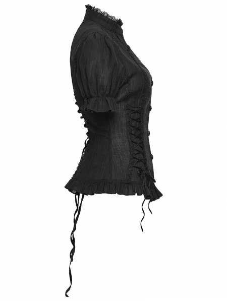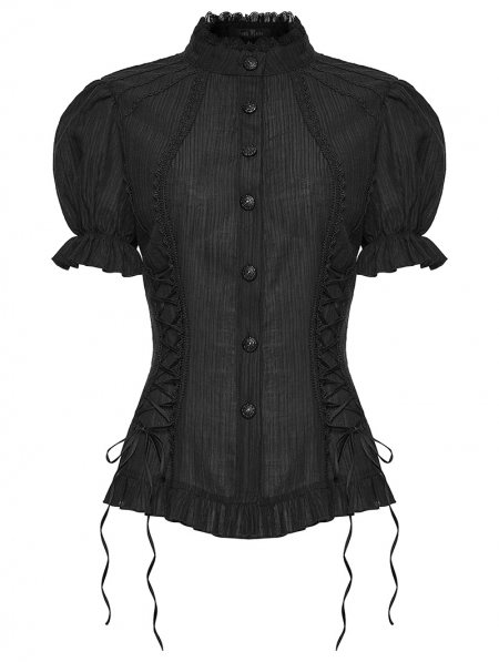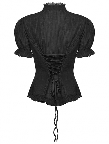 Black Gothic Textured Classical Ruffle Short Sleeve Shirt for Women