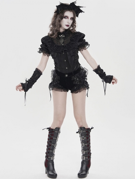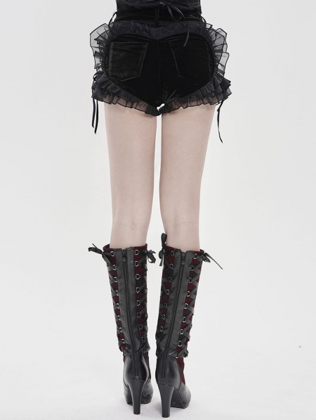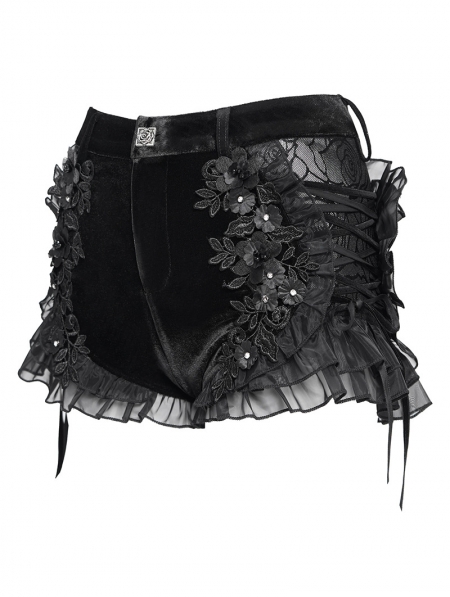 Black Gothic Flower Applique Ruffle Velvet Shorts for Women