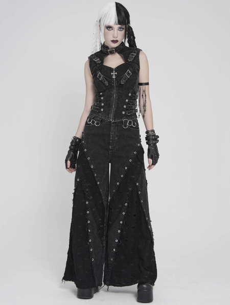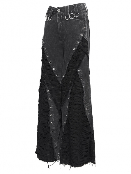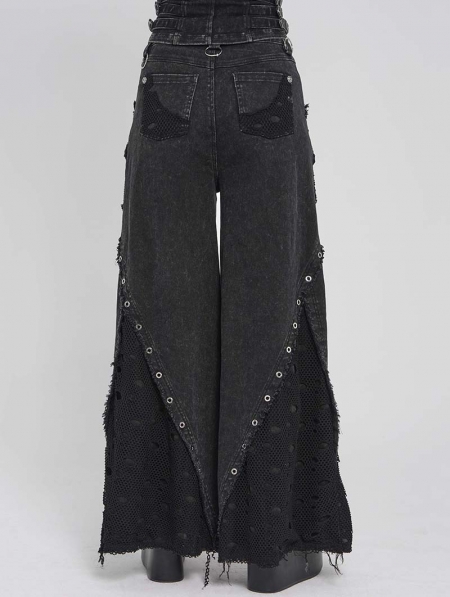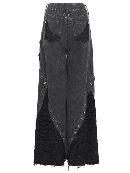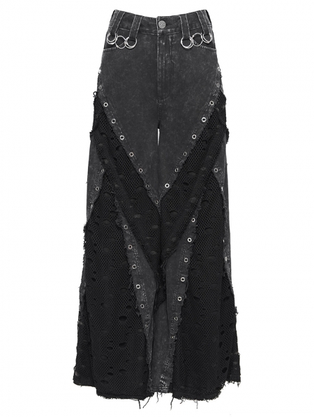 Black Gothic Distressed Eyelet Punk Wide Leg Pants for Women