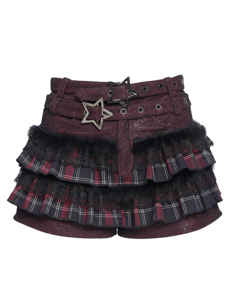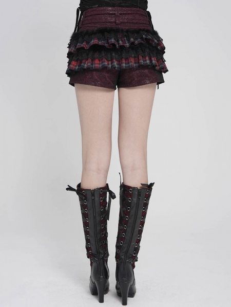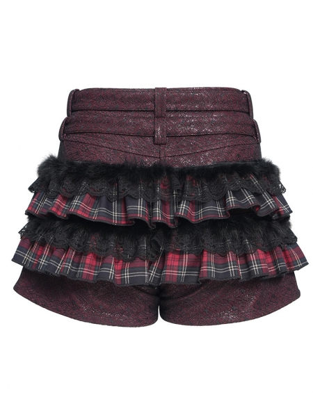 Red Gothic Plaid Fur Trim Frill Hot Pants for Women