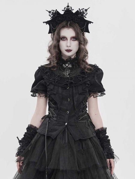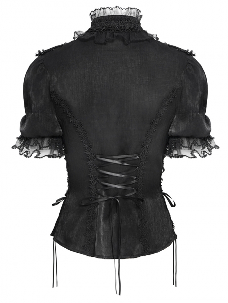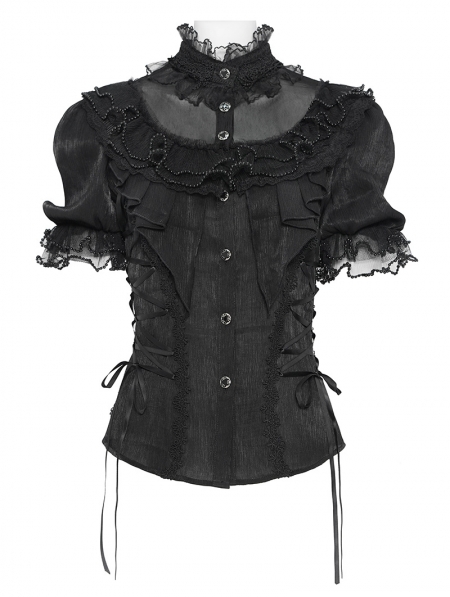 Black Retro Gothic Ruffles Lace Beaded Short Sleeve Shirt for Women