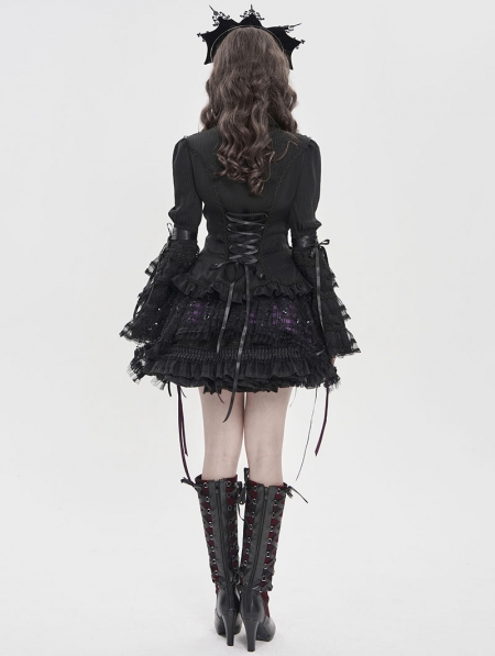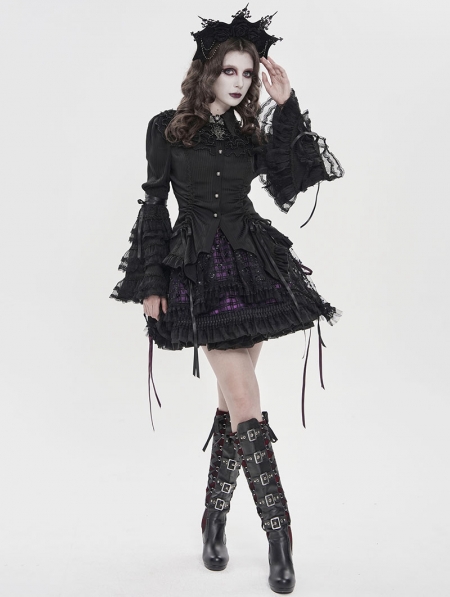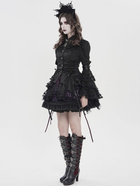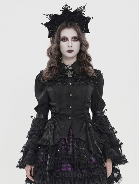 Black Retro Gothic Long Flared Sleeve Beaded Ruffle Shirt for Women
