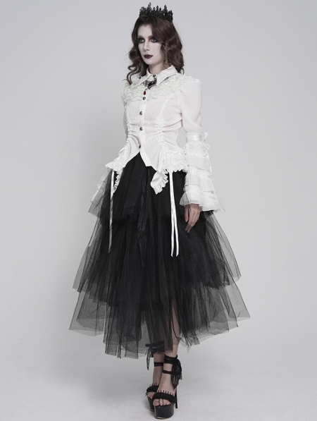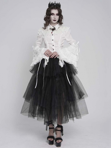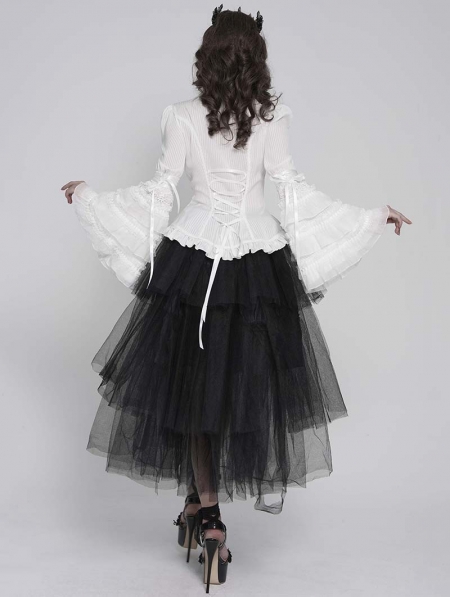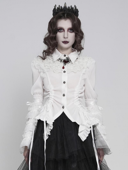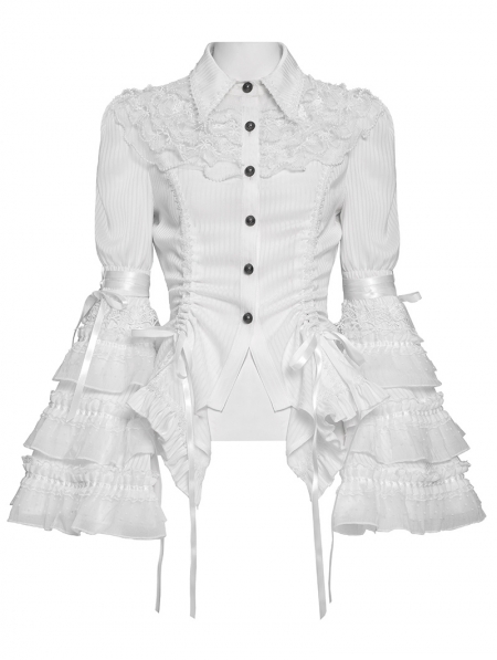 White Retro Gothic Long Flared Sleeve Beaded Ruffle Shirt for Women
