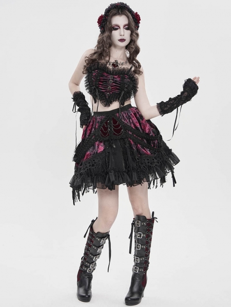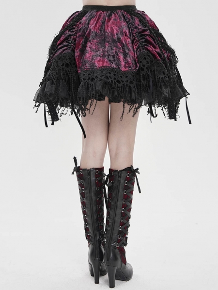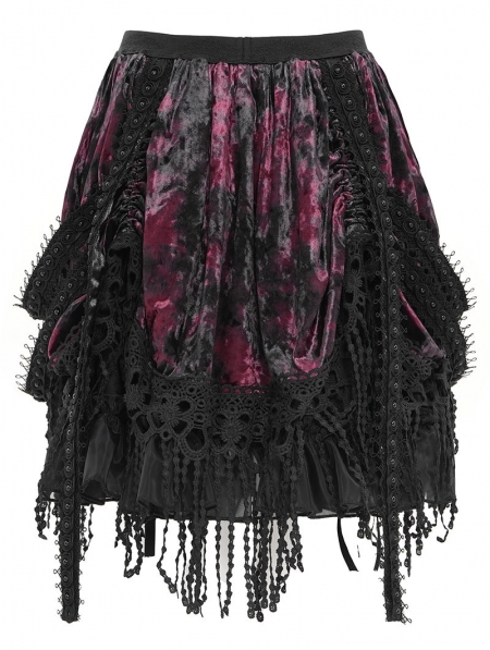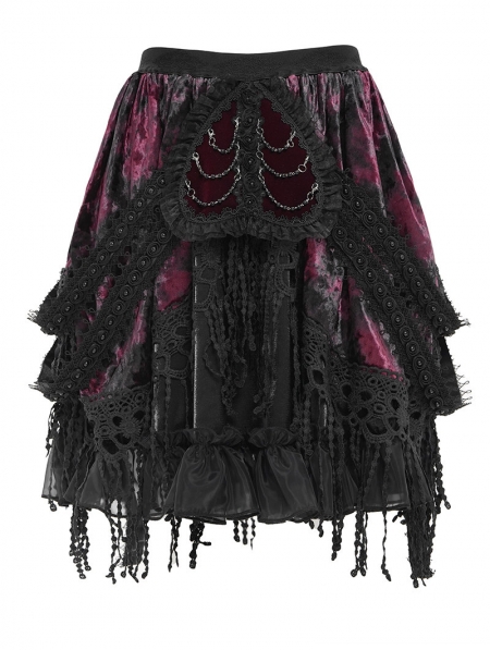 Black and Red Gothic Velvet Embroidered Fringe Short Skirt