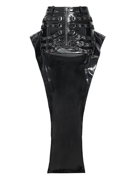 Black Sexy Gothic Punk Eyelet Split Glossy Leather Long Skirt