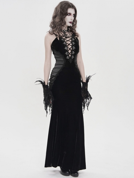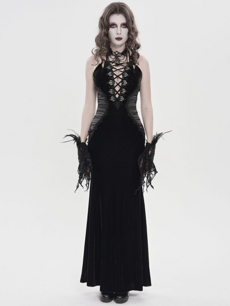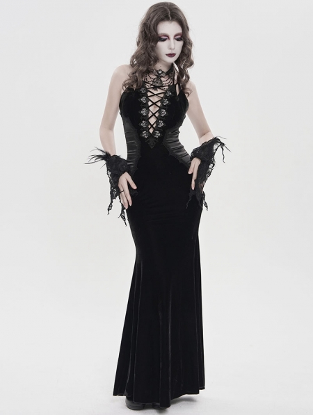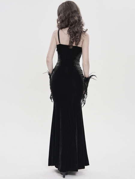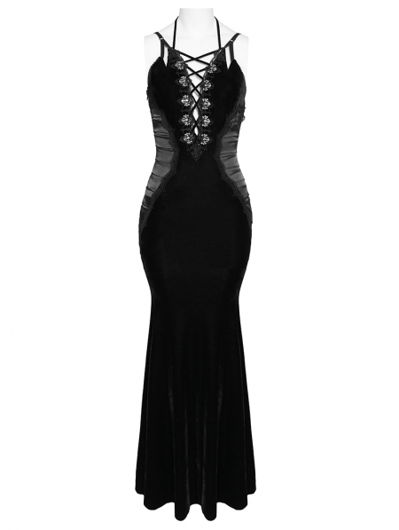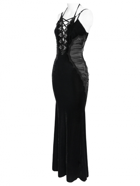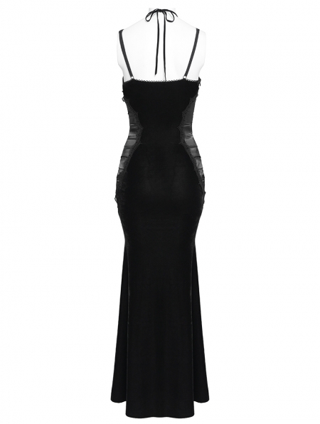Black Retro Sexy Gothic Plunging Strappy Velvet Long Fishtail Dress